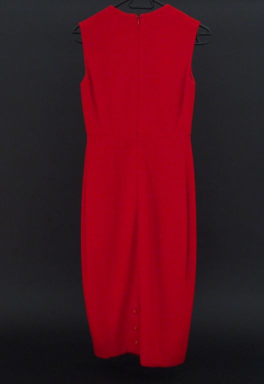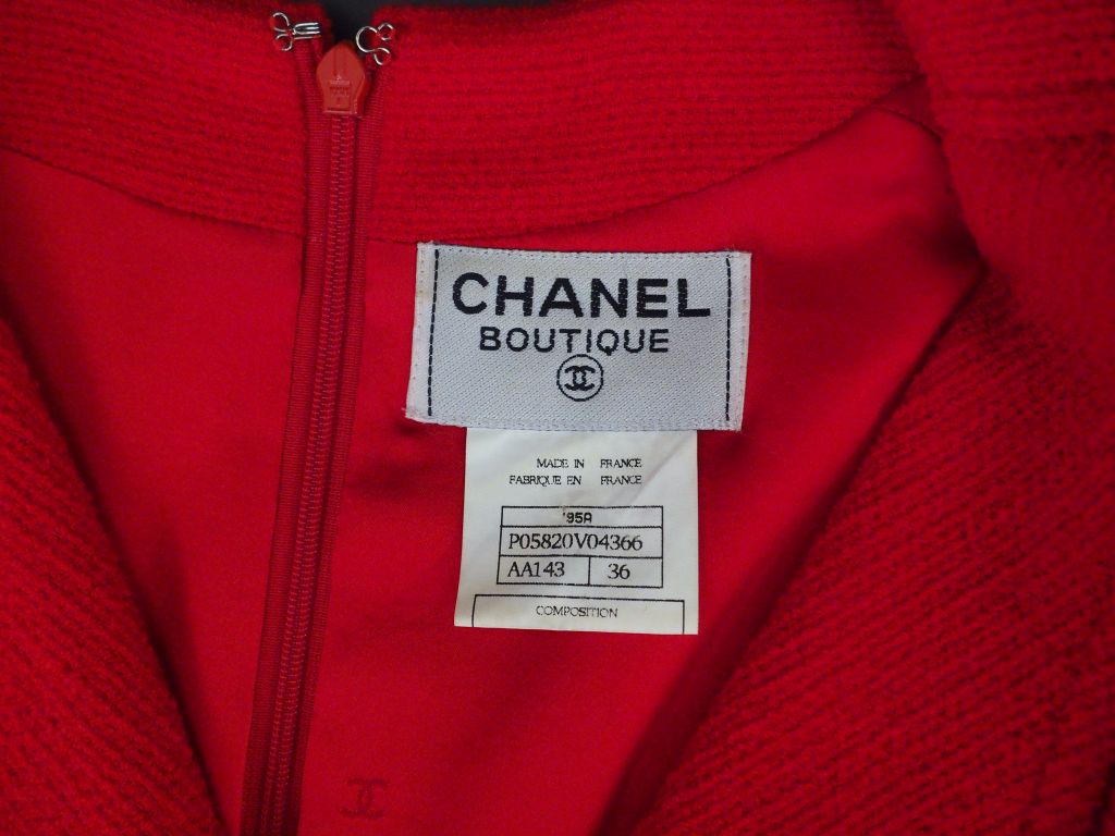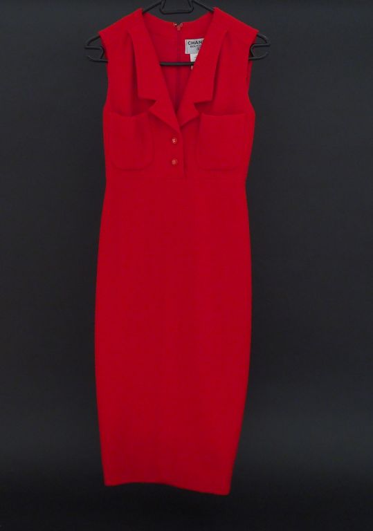 CHANEL Robe à col, sans manche rouge. Deux poches au niveau de la poitrine et deux boutons au centre. Fermeture éclair à l’arrière. Composition : 97% laine, 3% nylon. Doublure en soie (95%) et lycra (5%). Collection 95A. Taille 36.