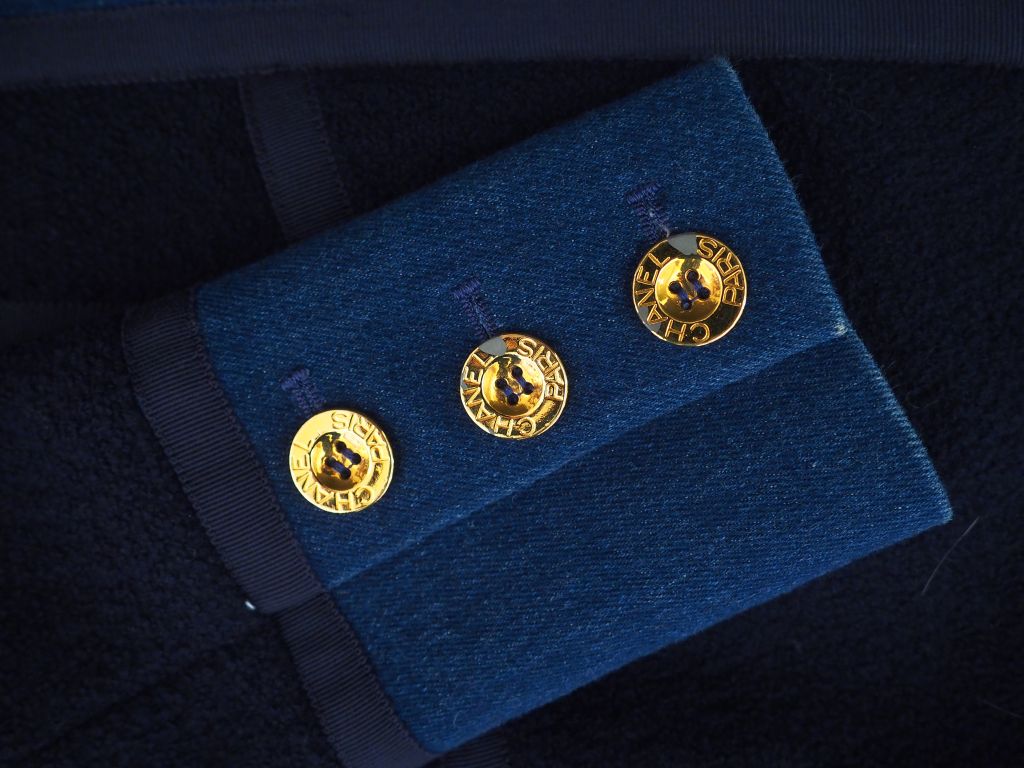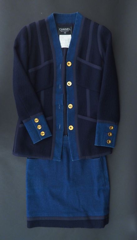 CHANEL Tailleur bleu en laine et coton comprenant une veste et une jupe. Ouverture par quatre boutons sur la veste. Un rang de trois boutons sur les manches. Quatre poches à l’avant. Deux poches à l’avant de la jupe et fermeture éclair à l’arrière. Collection 26. Modèle : 20701. Taille 36. Collection Automne-Hiver 1991-1992.