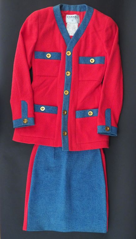 CHANEL Tailleur bleu et rose comprenant une veste et une jupe. Ouverture de la veste par cinq boutons dorés. Quatre poches à boutons à l’avant. Un bouton sur les manches. Jupe à pinces avec fermeture éclair à l’arrière. Composition : laine, coton et lycra. Doublure en soie (94%) et lycra (6%). Collection 26. Modèle 20724. Taille 36. Collection Automne-Hiver 1991-1992.
