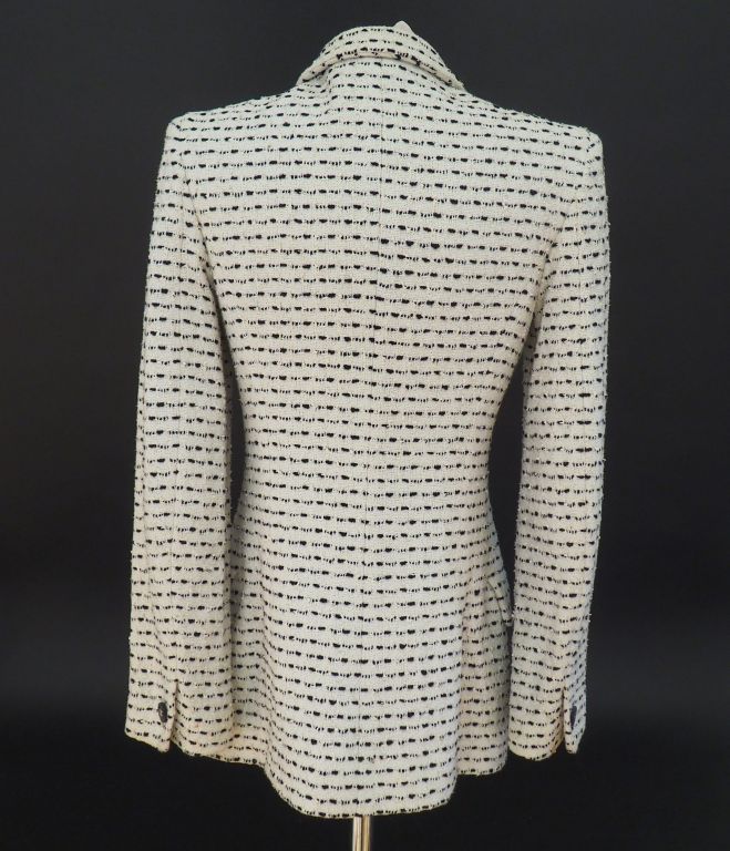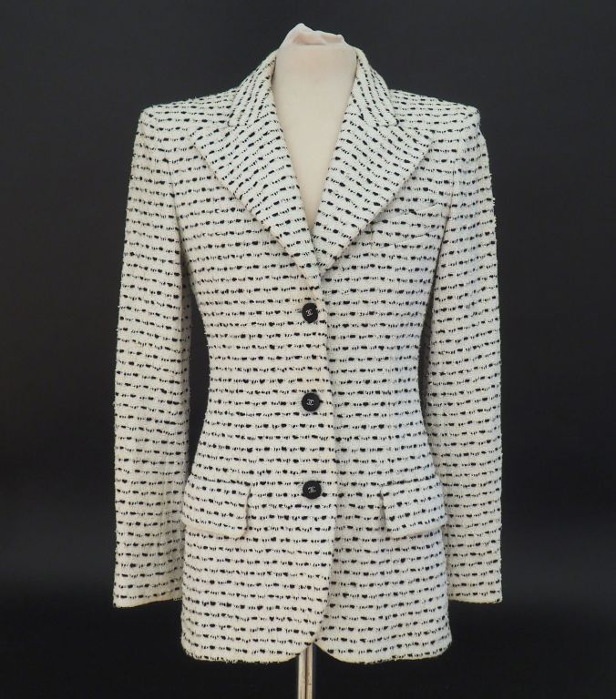 CHANEL Veste à col blanc et noir. Un rang de trois boutons à l’avant et un bouton sur les manches. Deux fausses poches latérales. Composition : 79% coton, 12% laine, 5% polyuréthane, 4% polyamide. Doublure : 95% soie, 5% lycra. Collection 98P. Taille 34. (deux taches sur la doublures, col jauni, doublure légèrement jaunie sous les aisselles).