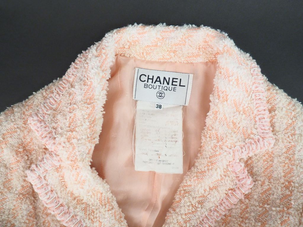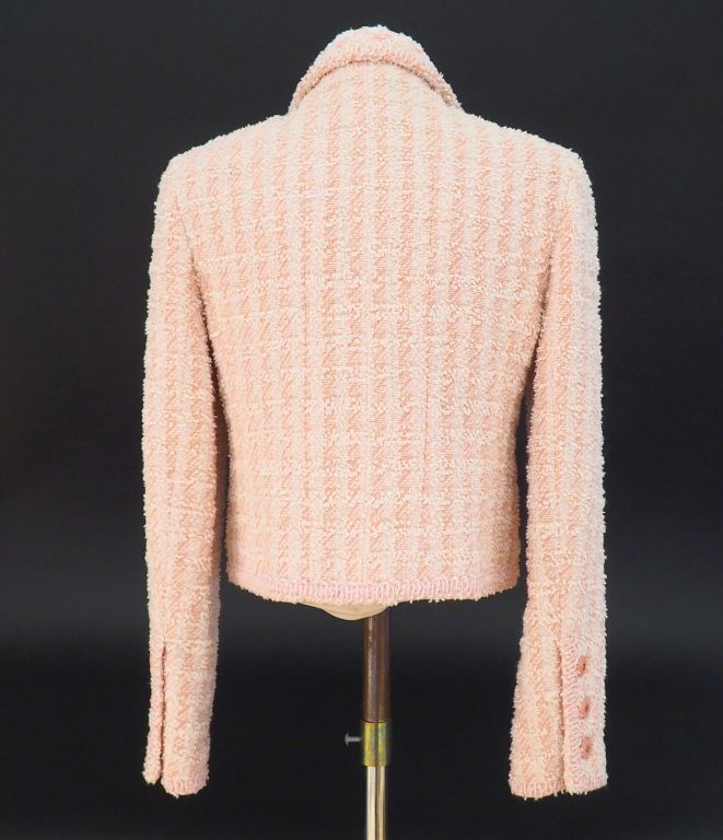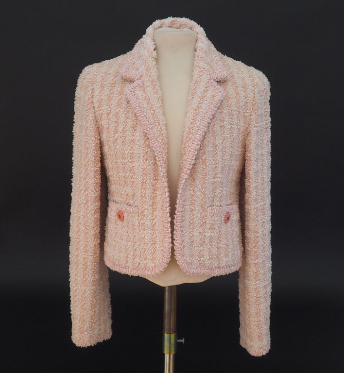 CHANEL Veste courte à col dans les tons roses et écru. Deux poches plaquées à boutons à l’avant. Un rang de trois boutons sur les manches. Composition : coton (48%), nylon (31%), laine (11%), acrylique (10%). Doublure en soie. Taille 38. (étiquette en partie effacée, encolure légèrement jaunie, traces de transpirations sur la doublure sous les aisselles)