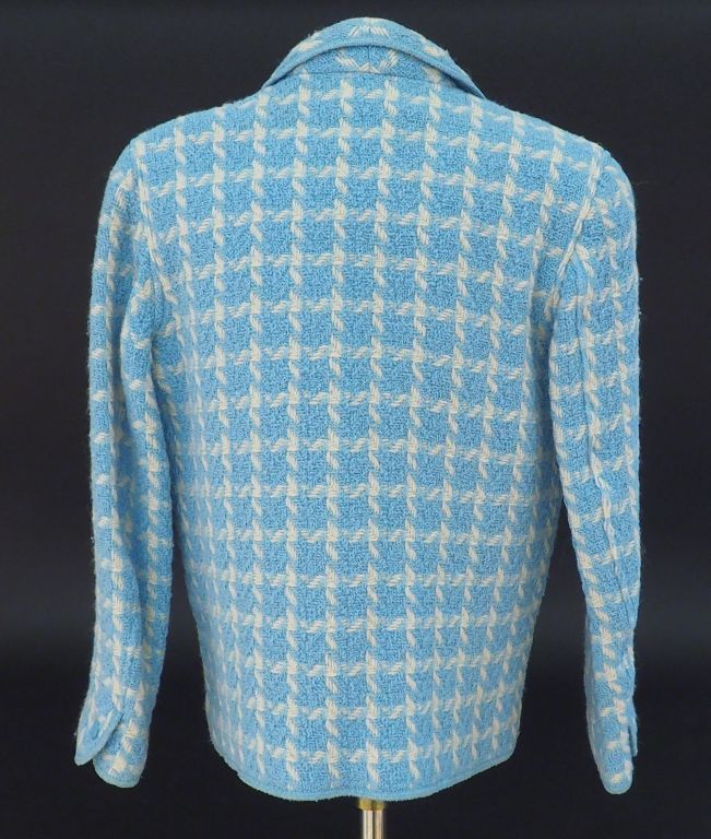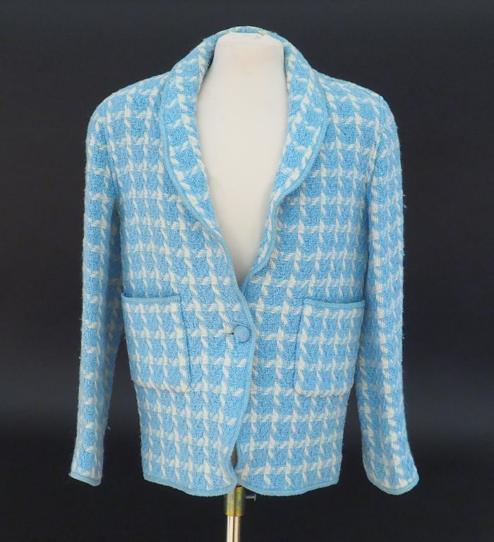 CHANEL Veste courte à col en tweed bleu ciel et blanc. Fermeture par un bouton à l’avant. Un bouton sur les manches. Deux poches latérale. Taille 36.