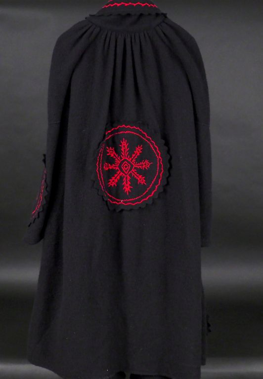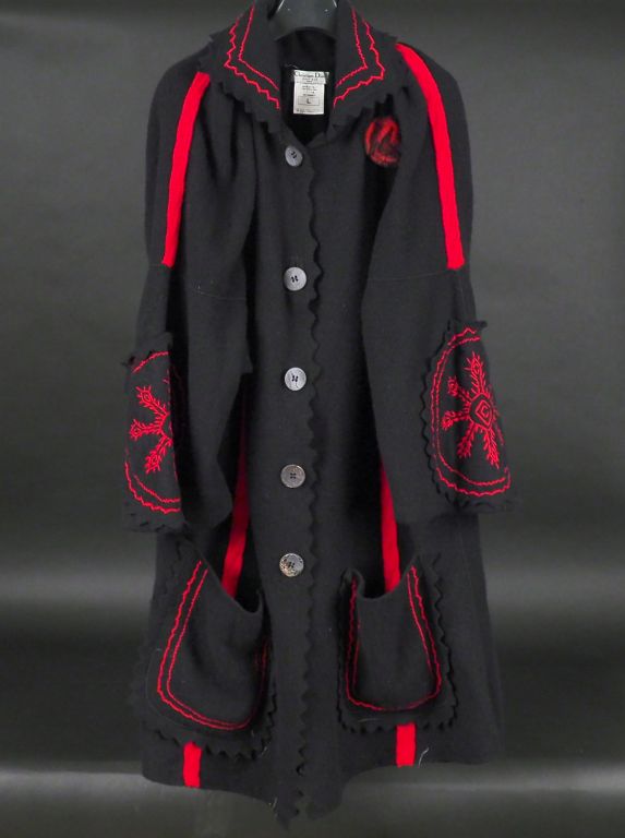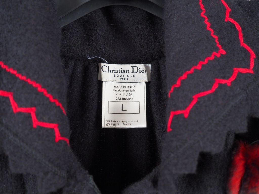 CHRISTIAN DIOR Manteau noir, à décor de flocons rouges aux manches et au dos, en laine, angora et élasthane. Fermeture par cinq boutons. Deux poches plates à décor de deux galons rouges. Taille L.