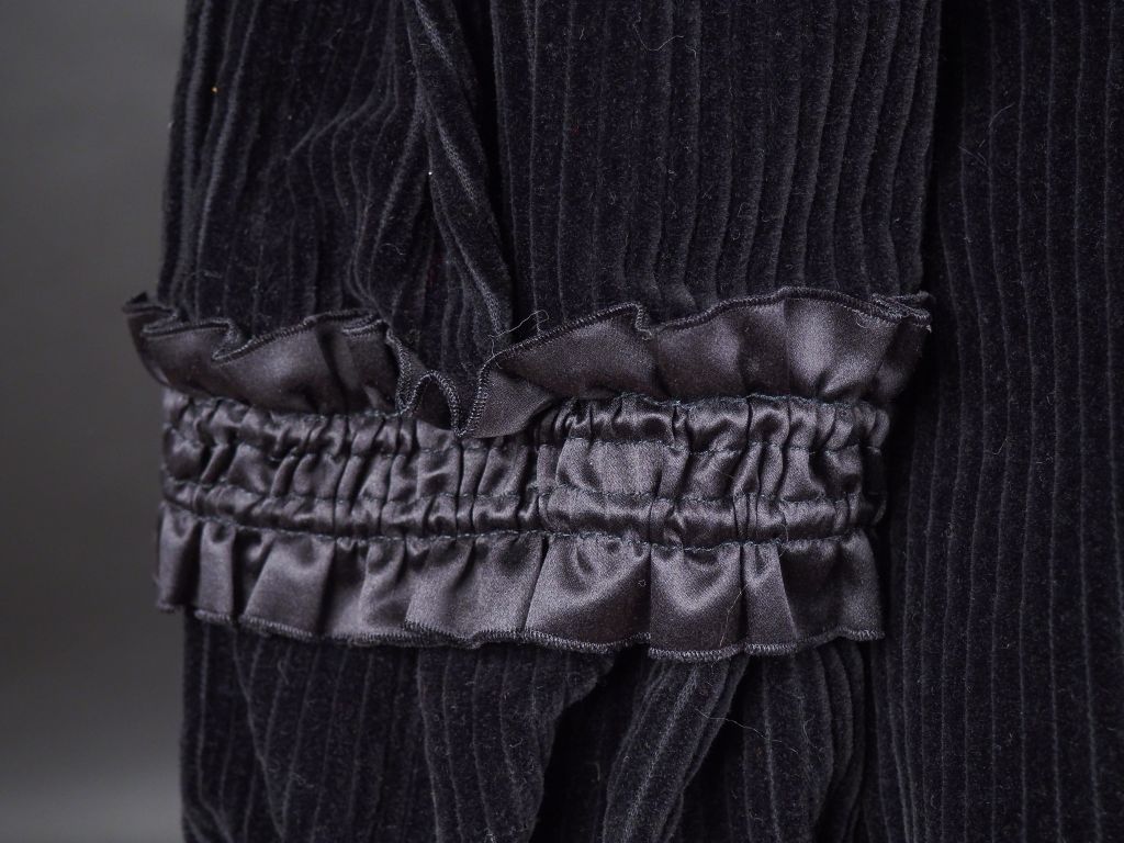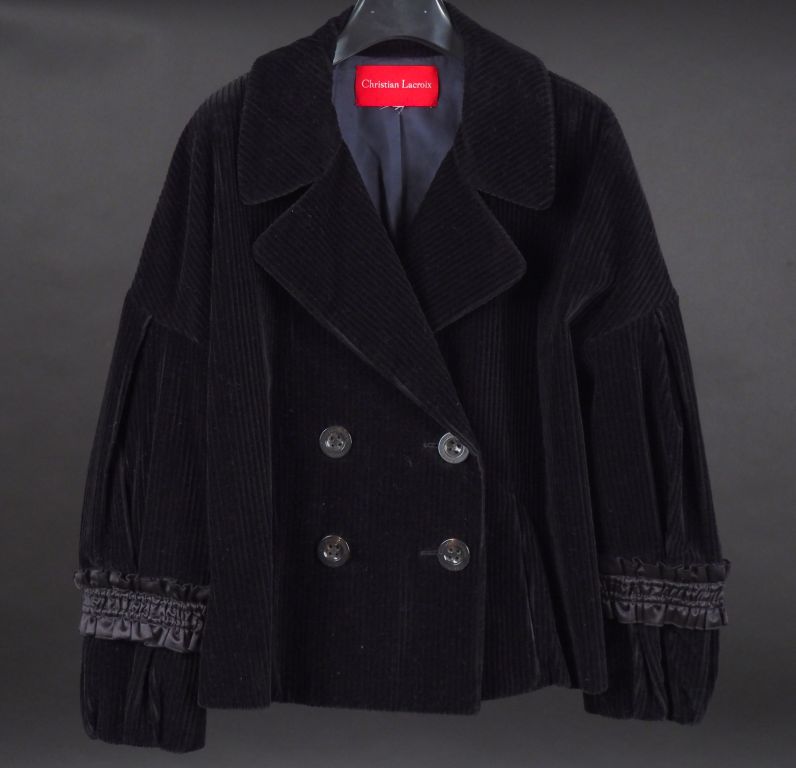 CHRISTIAN LACROIX Veste noire à col, en velours côtelé. Deux rangs de deux boutons. Décor de frises aux manches.