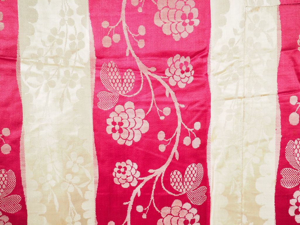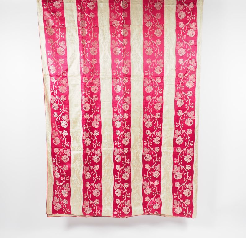 Couverture XVIIIème siècle, lampas à rayures rose et crème. 2, 27 de haut/ 2, 58 de large.Probablement robe démontée Décor liseré de branches fleuries montantes. Bel état d'usage. Expert : Véronique Dumont Castagné