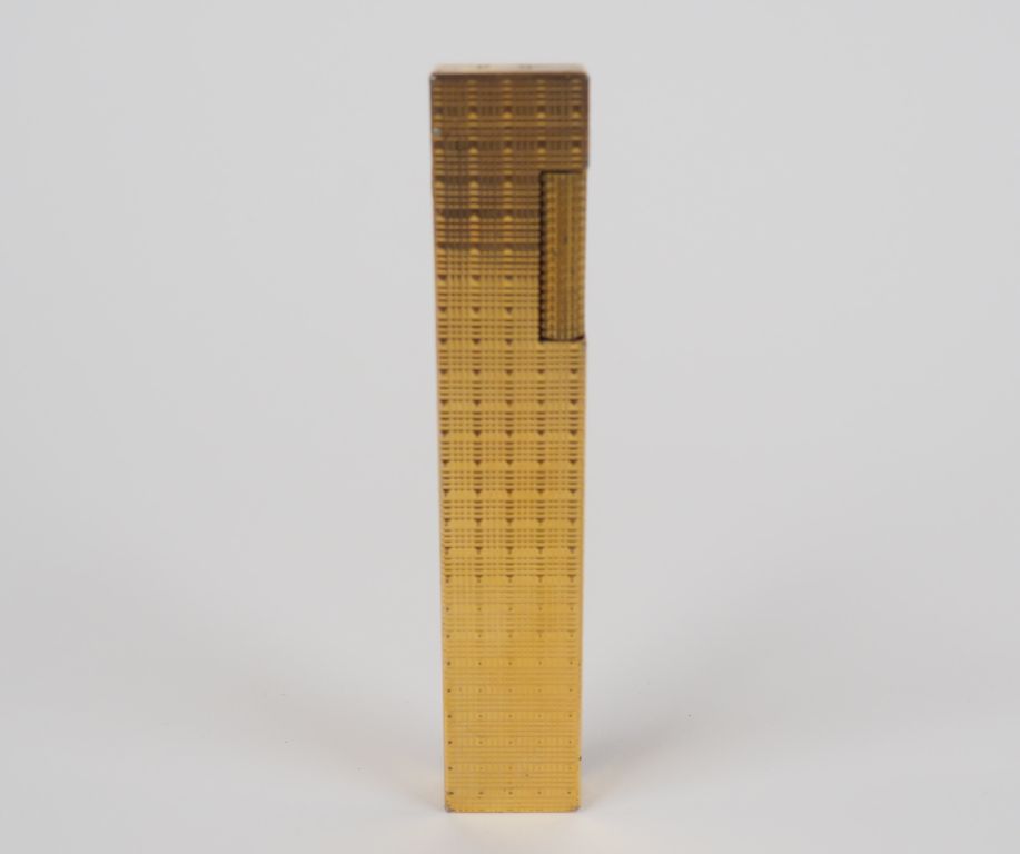 DUNHILL Important briquet de forme rectangulaire en métal doré, à décor géométrique. H. 12,5 cm