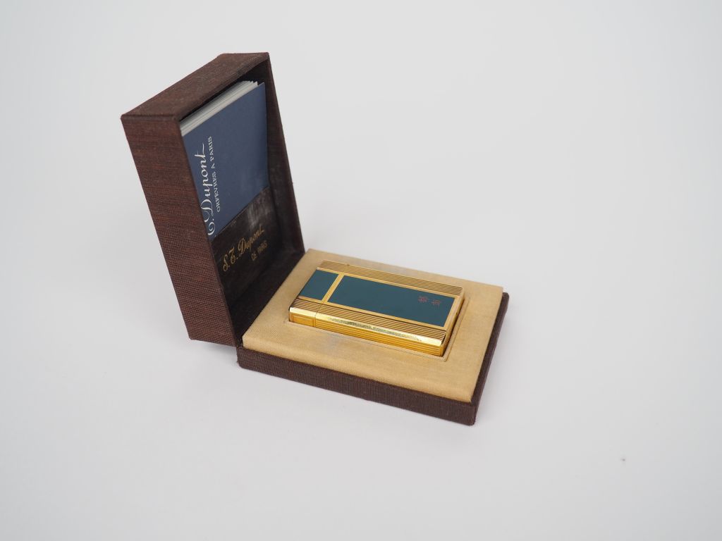 DUPONT, Paris Briquet en métal doré et laque verte. Signé. Numéroté Y4JE91. 5,7 x 3,5 cm Dans son ecrin, avec ses papiers.