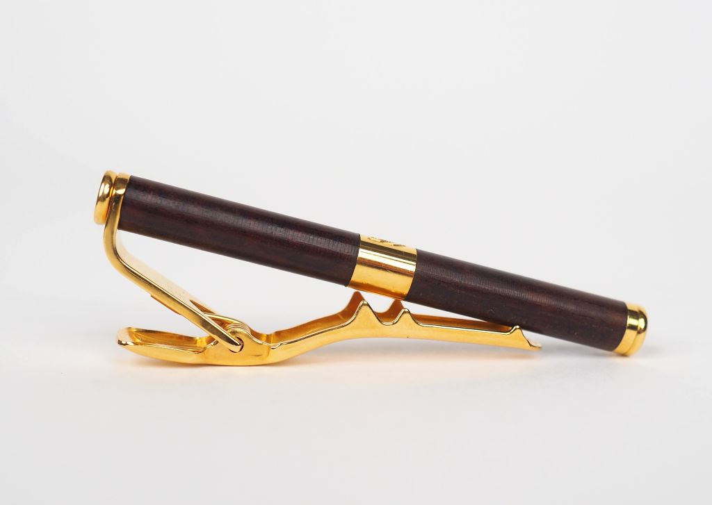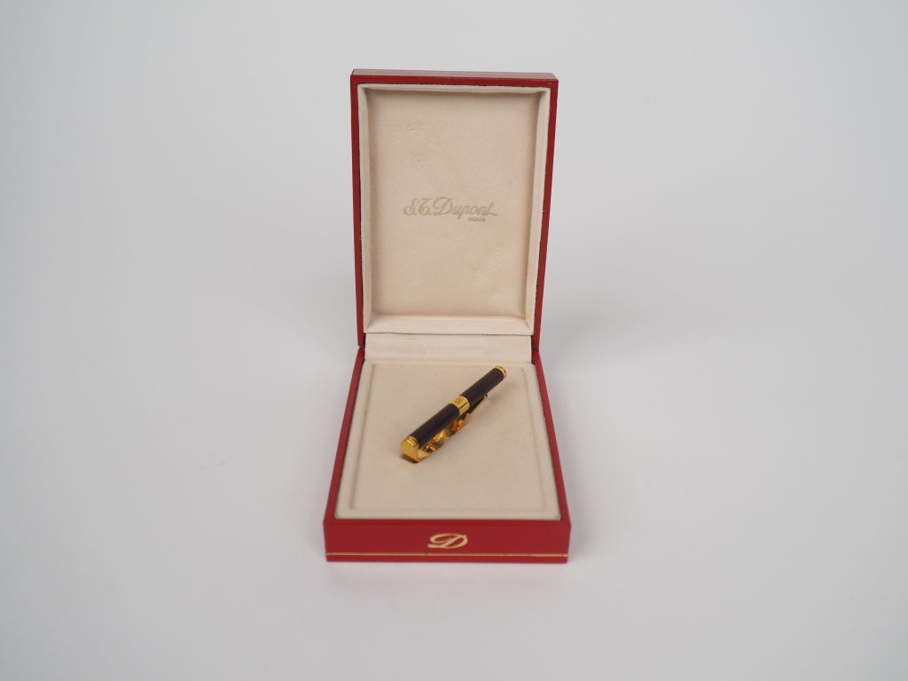 DUPONT, Paris Pince à cravate en composition et métal doré. Signée. Dans son écrin. Longueur : 5,5 cm