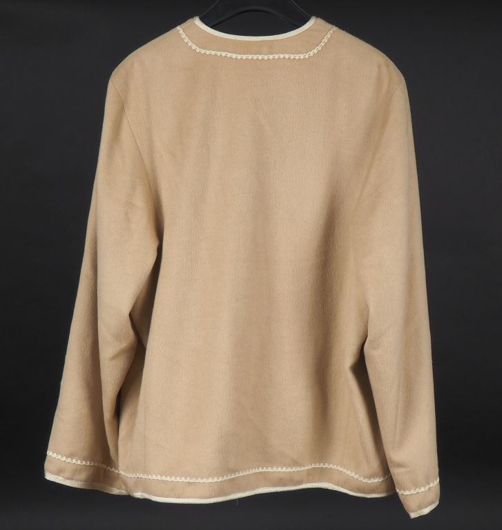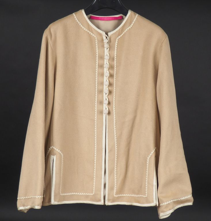 EMANUEL UNGARO Veste crème à col rond, à décor d'un galon blanc, en angora. Fermeture par neuf boutons. Doublure en polyester. Taille 44.