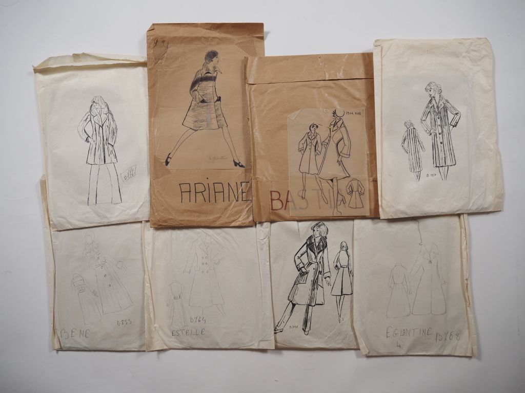 Ensemble de trente et un patrons de couture. Tous dans leur pochette en papier, sauf un. (états variables, sans garantie que les patrons soient tous complets)