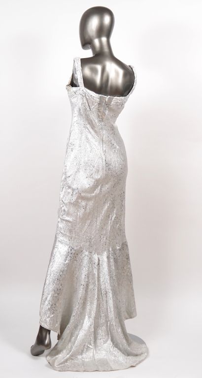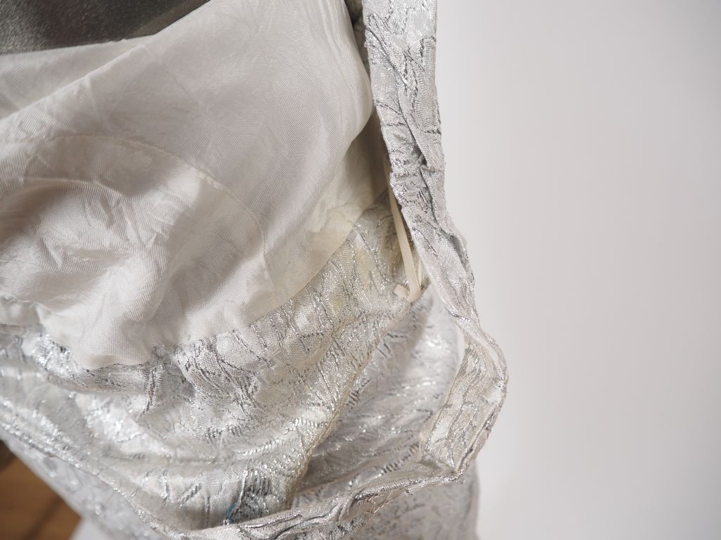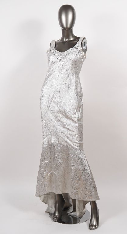 Franck USHER Robe de soirée à fine bretelle et traine en tissu à rehauts argentés. Des strasses agrémentent le haut de la robe. Taille UK. 12