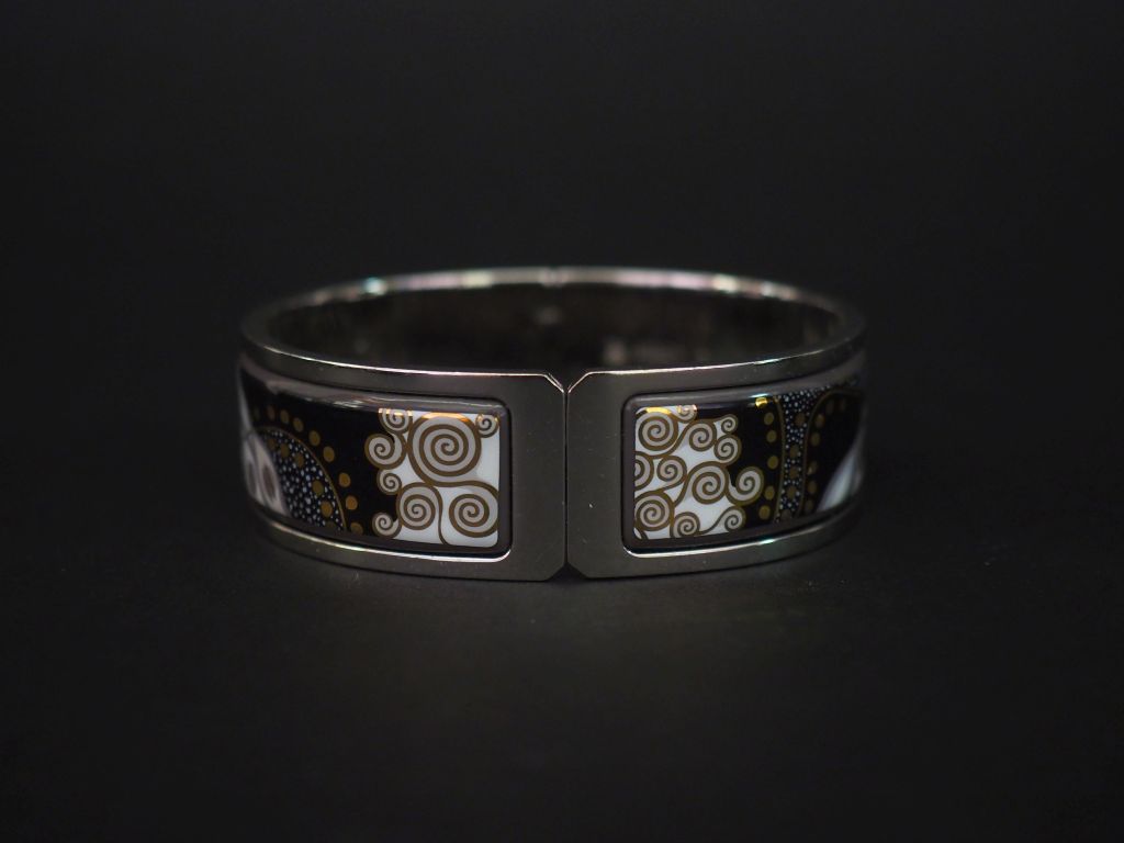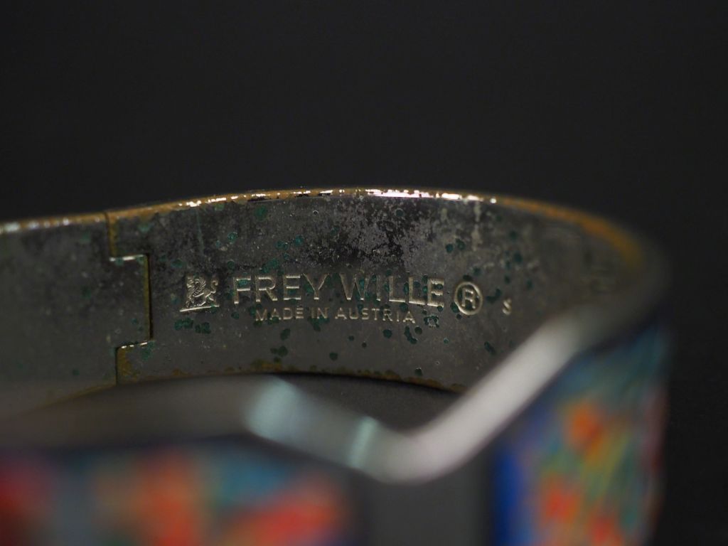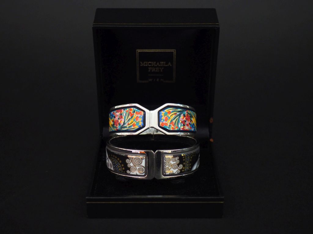 FREY WILLE, Ensemble comprenant : - un bracelet en métal argenté et émail dans les tons noir et gris rehaussé d'or. 5 x 5,9 cm Signé. Dans son écrin. - un bracelet en métal argenté et émail polychrome. 4,6 x 5,6 cm Signé. (piqué à l'intérieur)