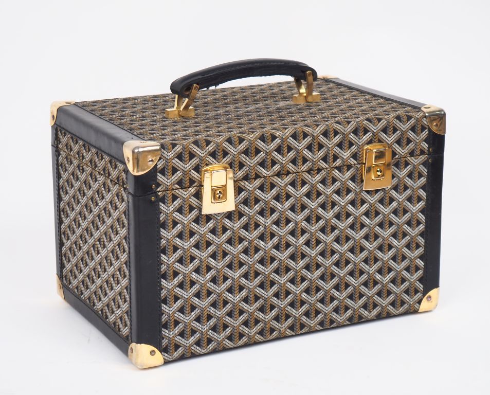 GOYARD, Paris Vanity en tissu gainé de cuir noir. Garniture en métal doré. Une poignée. Intérieur à deux compartiments et une poche plaquée. Couvercle agrémenté d'un miroir. Avec deux clés. Signé. 21 x 33,5 x 22 cm (petites usures, plastiques protecteurs à l'intérieur abimé)