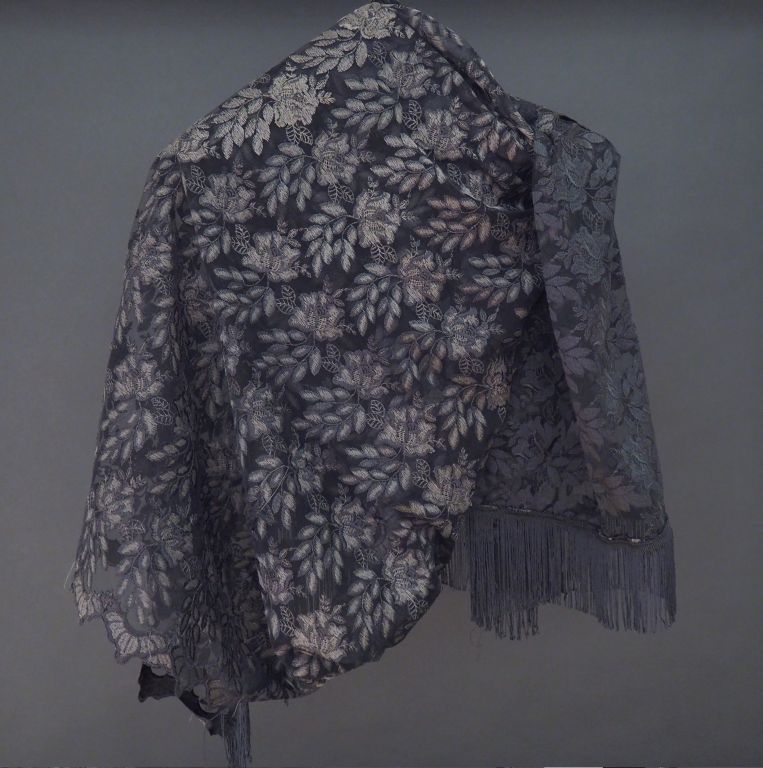 Grand châle noir en broderie, à décor de fleur. Les bords ornés de franges. 212 x 110 cm (légers accrocs)