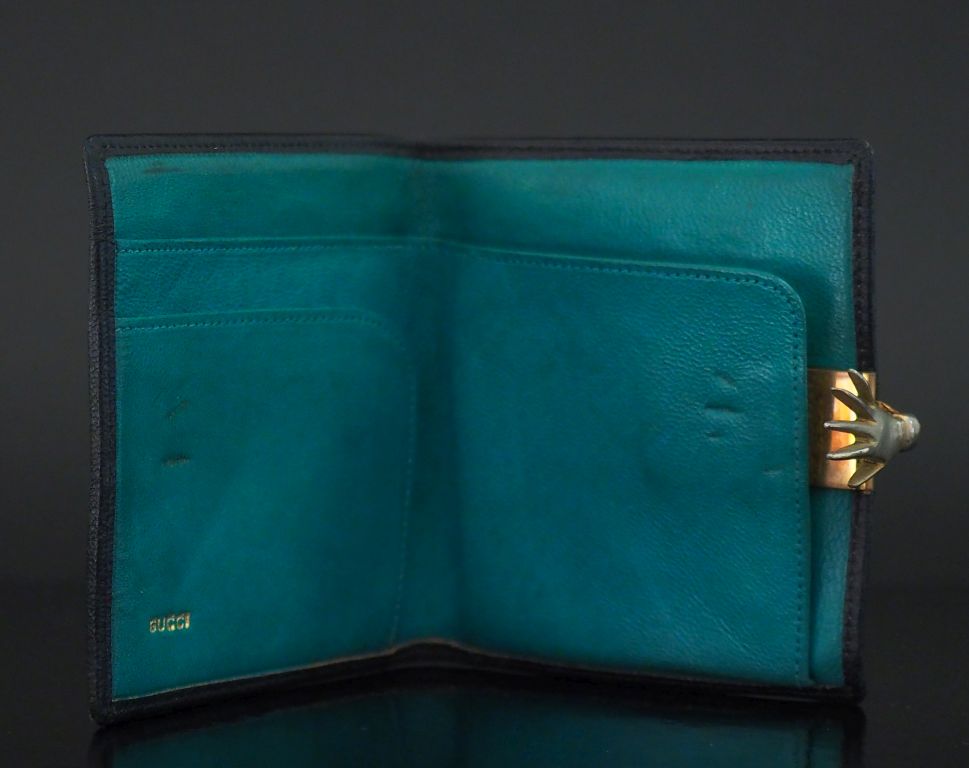 GUCCI Petite porte-monnaie vintage en cuir. Le fermoir en forme de main. Signé. 9,7 x 9 m (usures) On y joint un étui à cigarettes en cuir marron imitant le croco. 9 x 6 cm