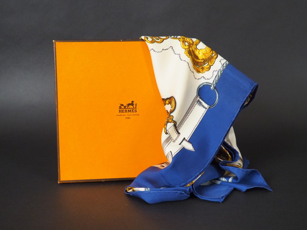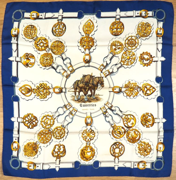 HERMES Carré en soie "Cuivreries", dans sa boîte. Signé F. de la Perrière. Carré sans étiquette. (Quelques taches).