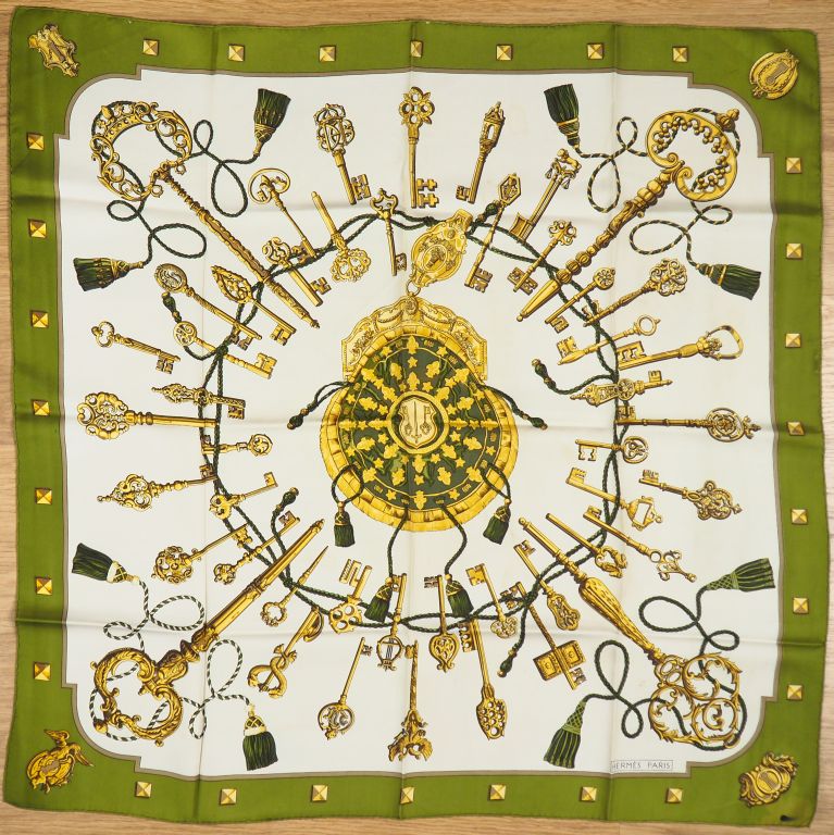 HERMES Carré en soie "Les Clefs", dans sa boîte. Carré sans étiquette. (Quelques taches).