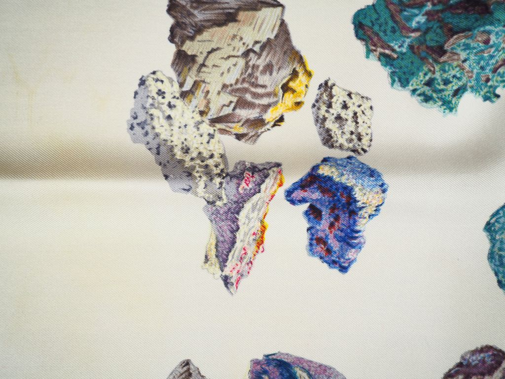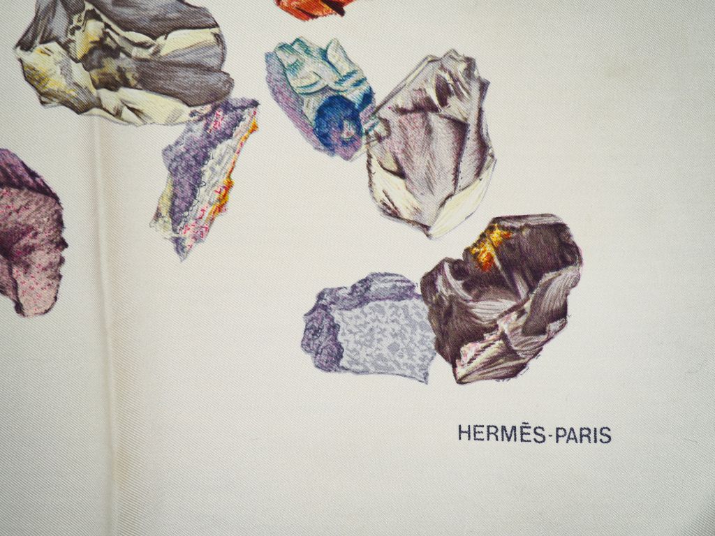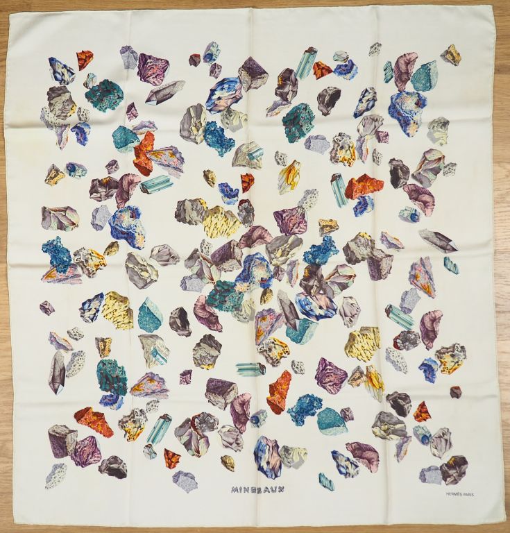 HERMES Carré en soie "Les Minéraux", dans sa boîte. Carré sans étiquette. (Quelques taches).