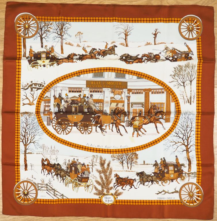 HERMES Carré en soie "L'Hiver en Poste", dans sa boîte. Signé Ledoux. (quelques taches).