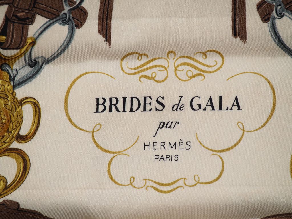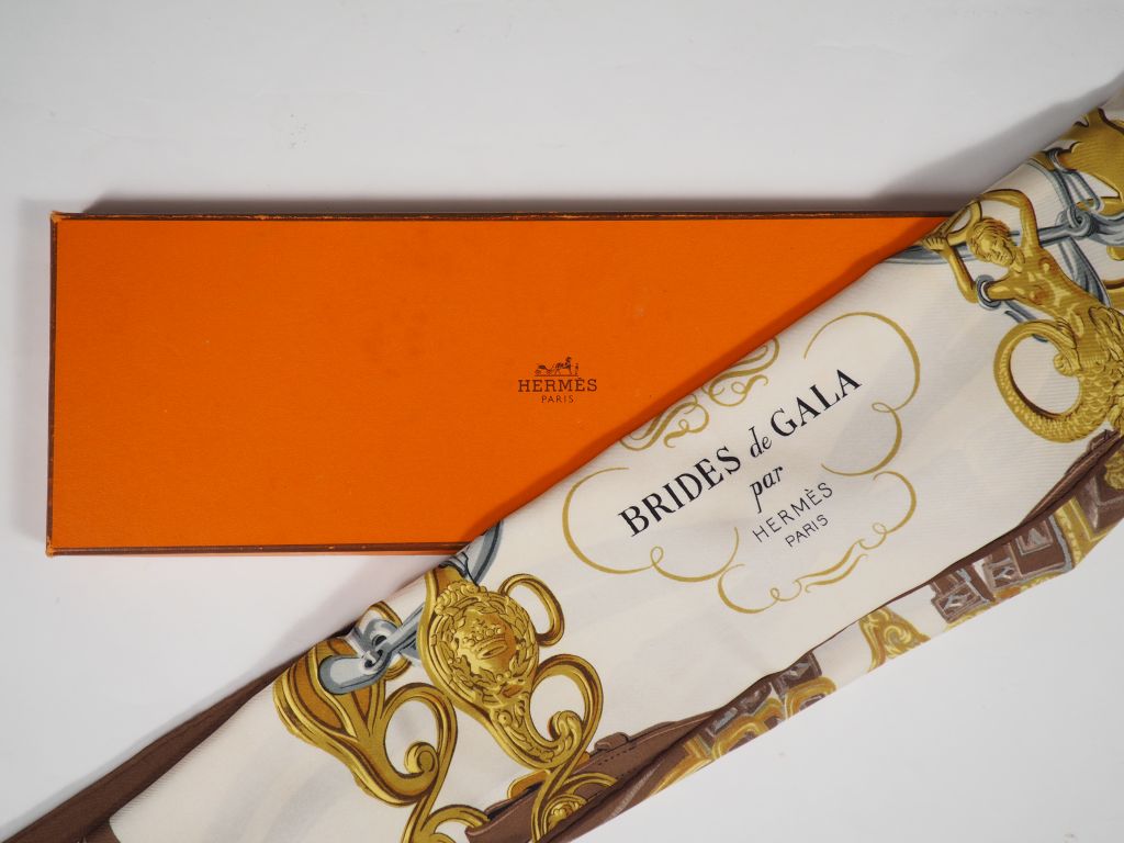 HERMES, Paris Carré de soie, modèle "Brides de Gala". Signé. 90 x 90 cm Dans une boite de cravate de la Maison. (petites tâches, quelques fils tirés)