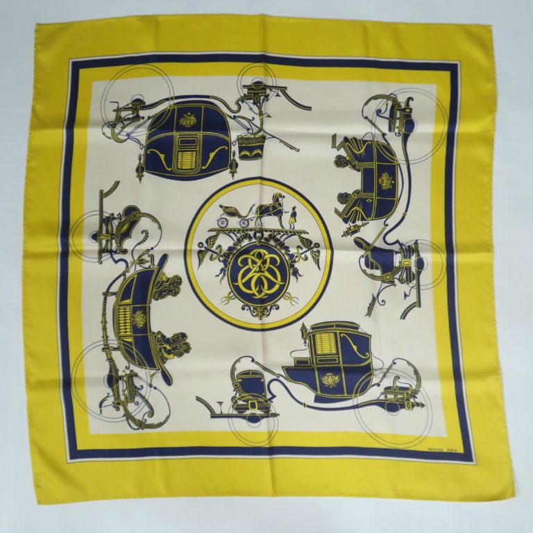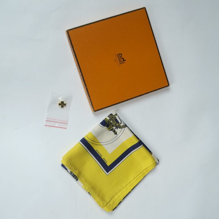 HERMES, Paris Carré de soie, modèle "Ex Libris". Signé. Dans sa boite malheureusement annotée. (accrocs, petites tâches) On y joint un pin's en métal doré Arthus Bertrand, en forme de croix.
