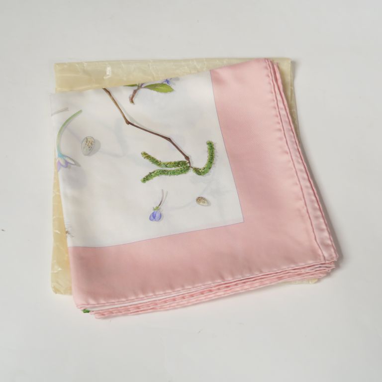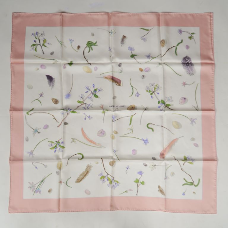 HERMES, Paris Carré de soie, modèle "Fleurs et plumes". 90 x 90 cm Signée. Dans sa pochette en papier d'origine.