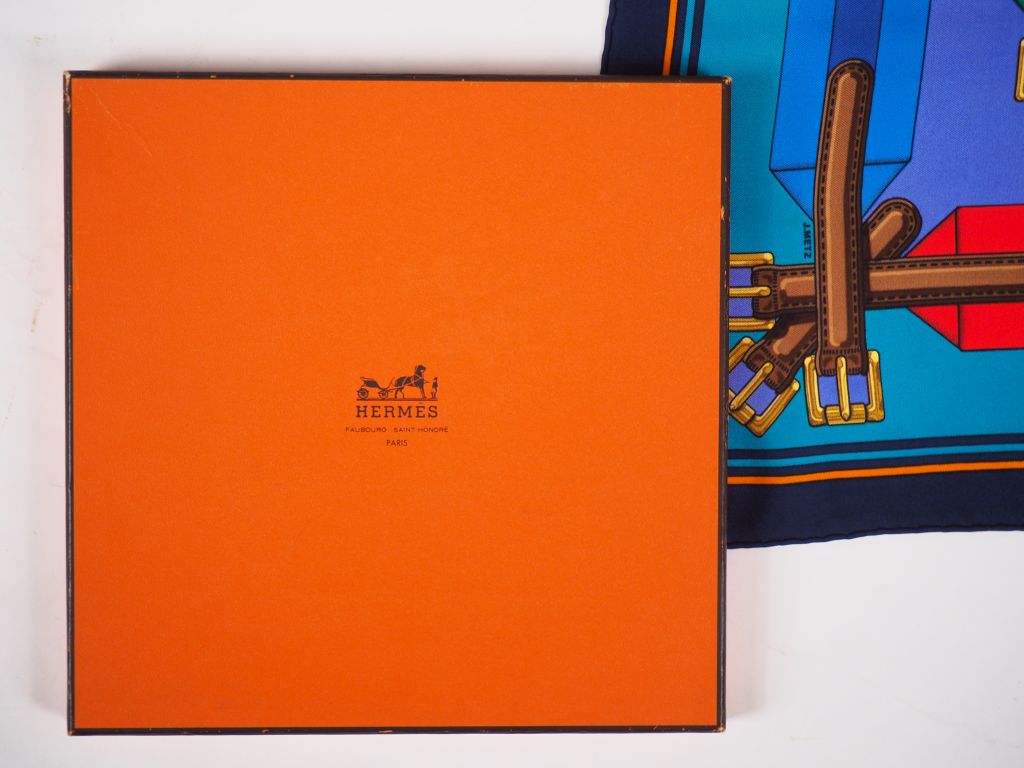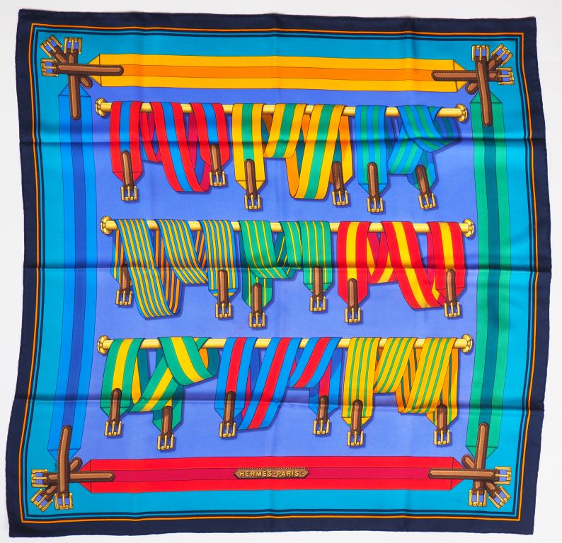 HERMES, Paris Carré en soie polychrome, modèle "Les sangles". Dessin par J. Metz. Signé. Dans sa boite (petite tâches)