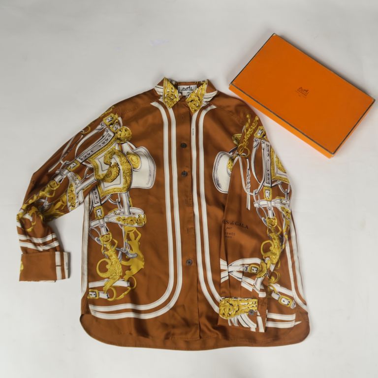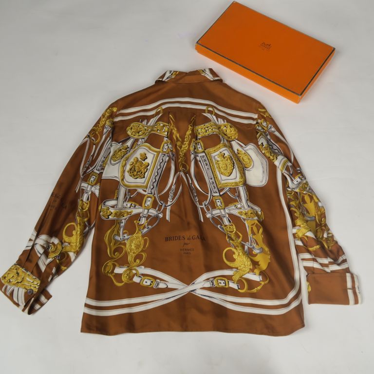 HERMES, Paris Chemise en soie, modèle "Brides de Gala". Taille. 36 Signée. Dans sa boite (légèrement accidentée) Petites tâches.