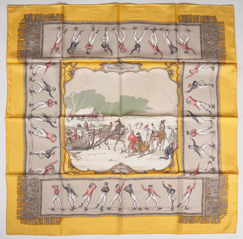 HERMES, Paris Foulard en soie polychrome, modèle "Les plaisirs du froid". Signé. Dans son étui. (petites taches)
