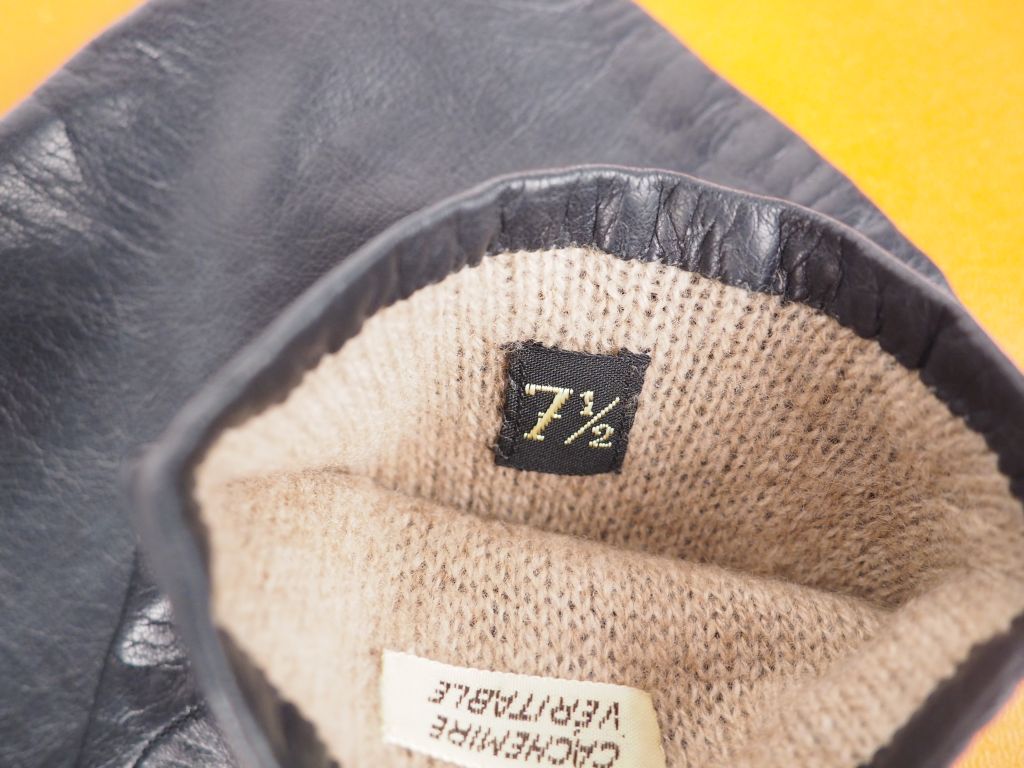 HERMES, Paris Paire de gants en cuir noir. Intérieure en laine (?) beige. Long. 28 cm Signés. Dans une boite de la Maison usée par endroits. (portés)