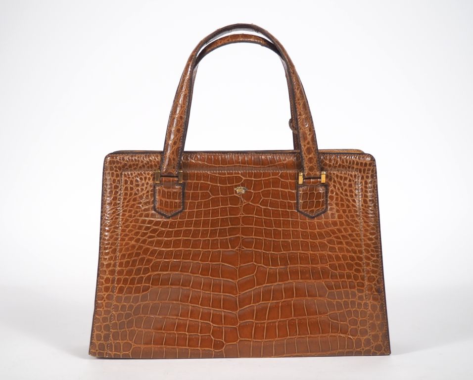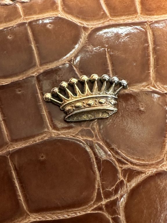 HERMÈS, Paris Sac modèle Pullman, en crocodile Porosus de couleur marron clair avec ses deux poignées montées sur dés. Intérieur doublé de peau d’agneau. Poche avec fermeture zippée à l’intérieur sur une face. L’intérieur du sac est doté d’un compartiment central articulé avec fermeture à serrure en laiton doré signé, partiellement gainée de cuir, dans lequel se trouve une poche à rabat pression. Clé, clochette, tirette. Garnitures en laiton doré. Le sac est personnalisé par une couronne comtale en or 18K fixée sur une face. Il s’agit d’une première main. Longueur à la base : ∓30 cm Mis en collection en 1936. Signé Hermès Paris Etat : pas d’usure majeure. Cuir souple. Quelques taches sous l’assise. Bibliographie : Suggestions Hermès 1936 / Mémoire des sacs Hermès II - sacs 2 poignées Arfon Maison d’édition Expert : Geneviève Fontan