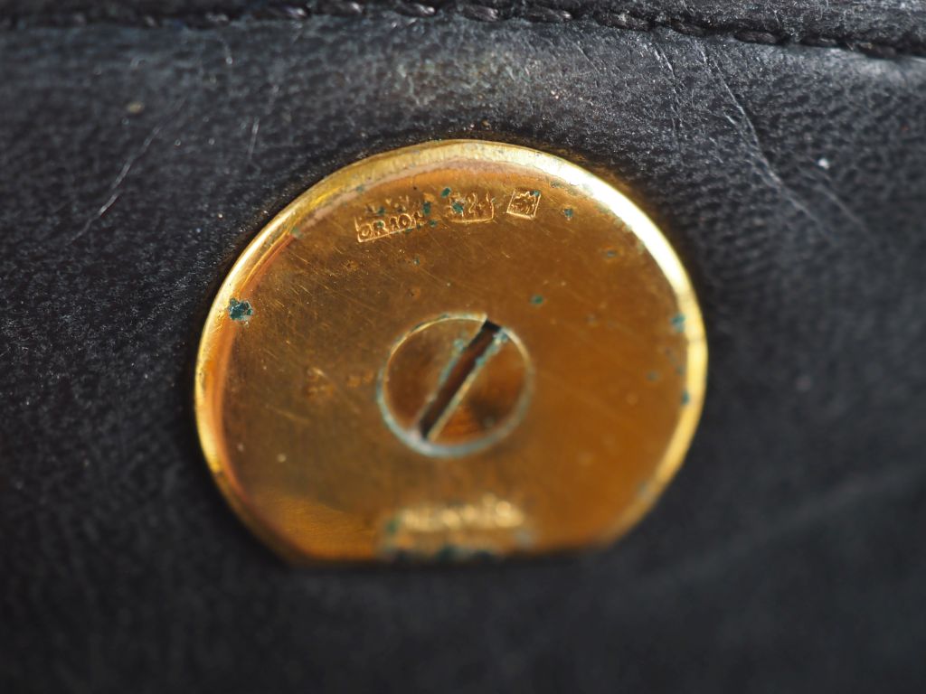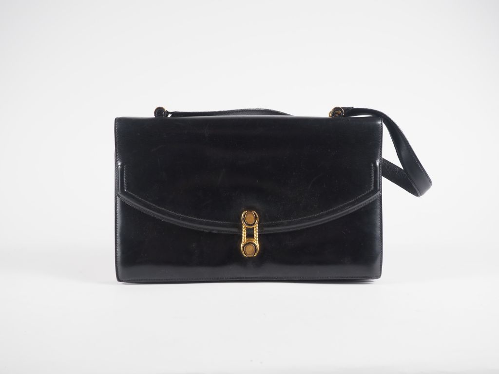 HERMES, Paris Sac vintage porté épaule en cuir noir. Intérieur à trois compartiments, une poche plaquée et une poche à rabat et pression. Femerture torsadée en métal doré. Signé. 17,5 x 28 cm (usures d'usages)