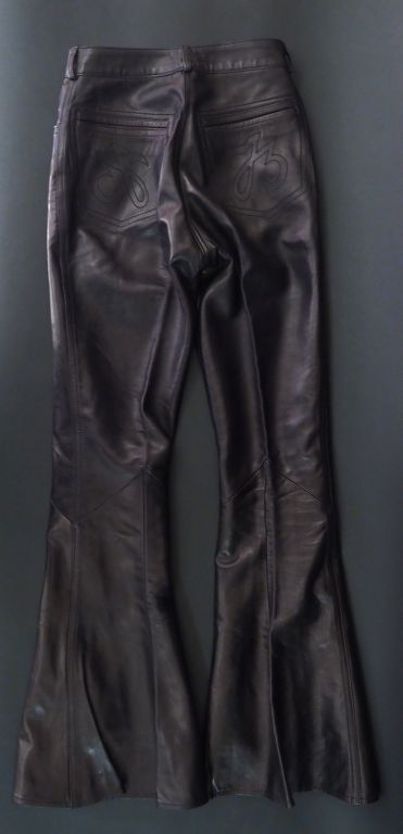Jean-Claude JITROIS Pantalon évasé en cuir noir. Cinq poches. Braguette et bouton à l’avant. Taille 38.