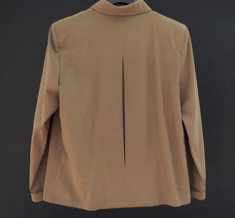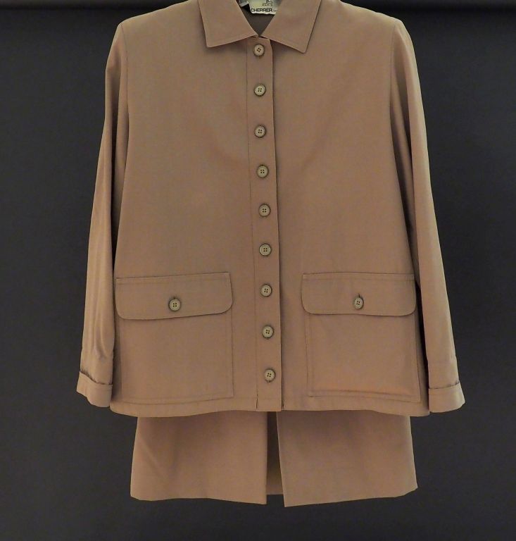 Jean-Louis SCHERRER, boutique Ensemble de tailleur en laine (100%) kaki, comprenant : - une chemise à manches longues. Fermetures par des boutons. Deux poches à rabat et bouton à l'avant. - une jupe et sa ceinture. Agrémentée à l'avant d'un pli. Fermeture par zip. Pas d'indication de taille, doit correspondre à un 40 (minimum).