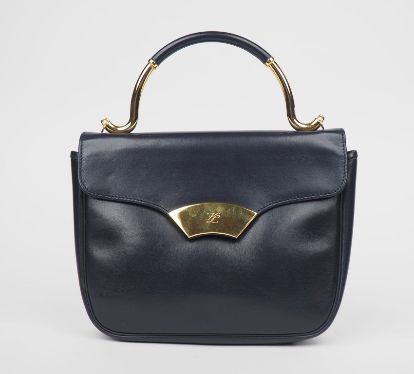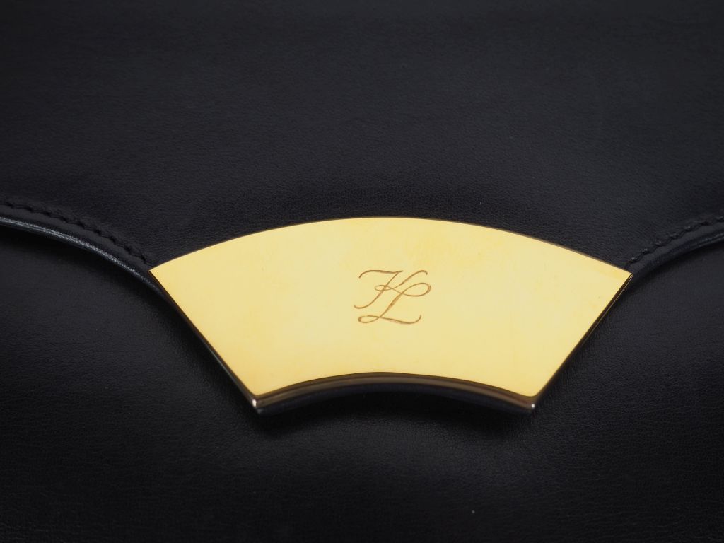 KARL LAGERFELD Sac à main en cuir bleu marine. Fermeture à rabat et bouton pression découvrant un compartiment central à une poche à zip. Une anse en métal doré gainée de cuir. Ornements en métal doré. Signé. 17 x 20,5 x 5 cm Avec son dustbag et sa carte d'authenticité.