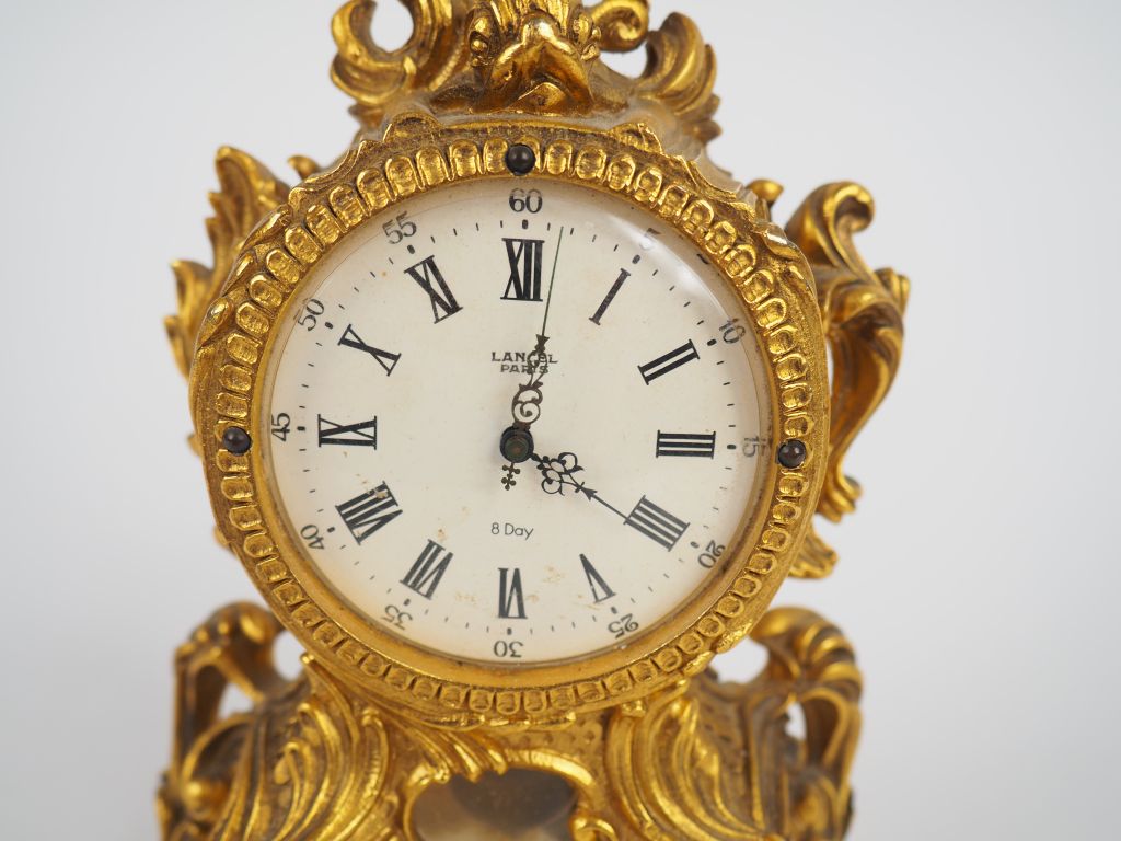 LANCEL, Paris Pendulette de style Louis XV en métal doré. Cadran rond à chiffres romains pour les heures et arabes pour les minutes. Signée. H. 20 cm