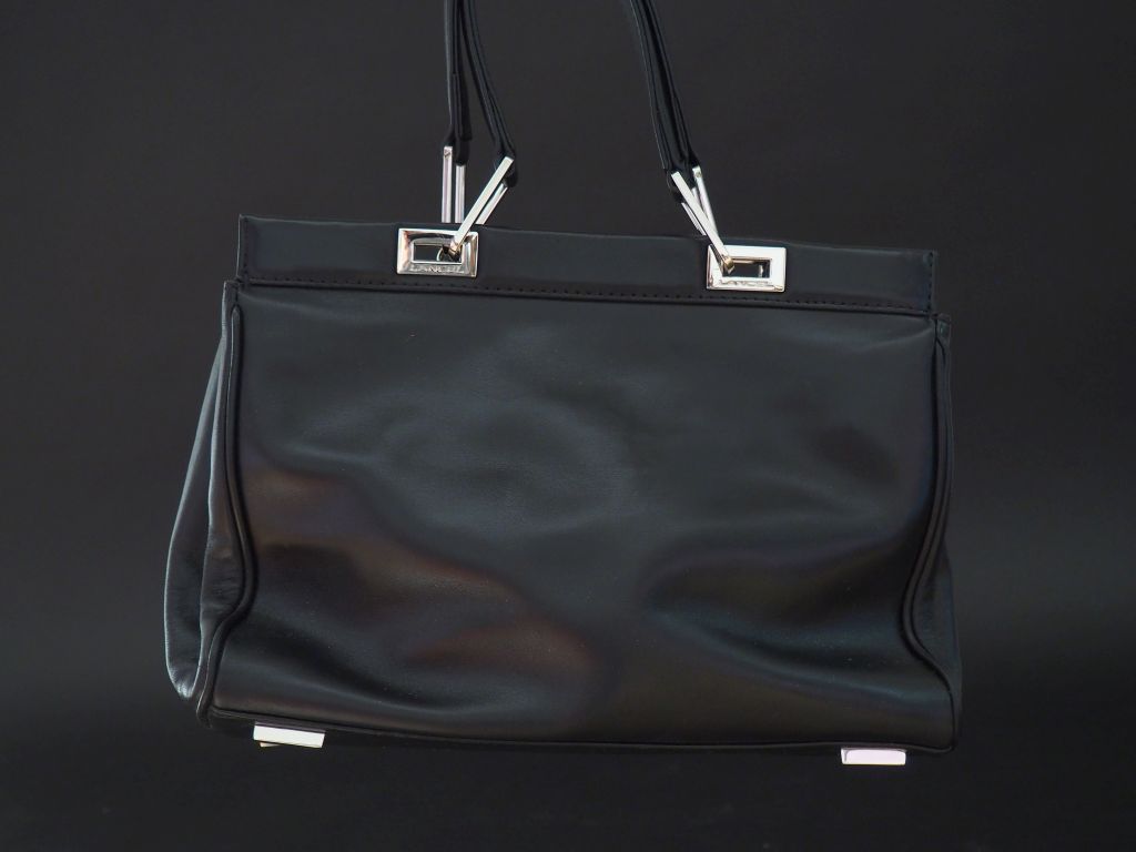 LANCEL, Paris Sac à mains balancel en cuir lisse noir. Grande poche extérieure zippée. Intérieur à deux compartiments, l'un à une poche zippée et l'autre à deux poches latérales de tailles différentes. Deux anses. Garniture argentée. 21,5 x 29,5 x 10 cm (état d'usage)