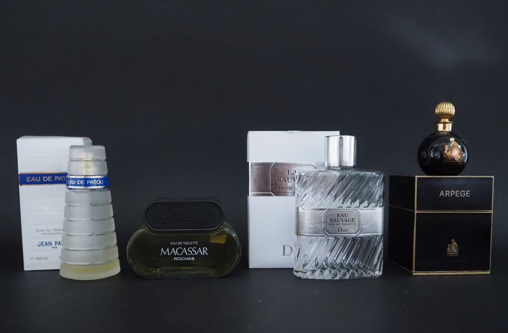 LANVIN Arpege. Dans son coffret Vide. JEAN PATOU Boite et flacon vide. EDT DIOR Eau sauvage, EDT. Flacon et boîte vide. ROCHAS Macassar, EDT. Grand flacon factice.