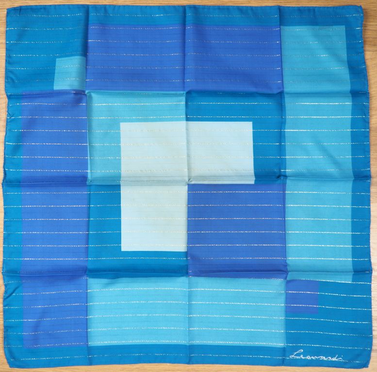 LEONARDI. Foulard probablement en soie, dans les tons bleus, violet et rehaussé de fils dorés. Signé.