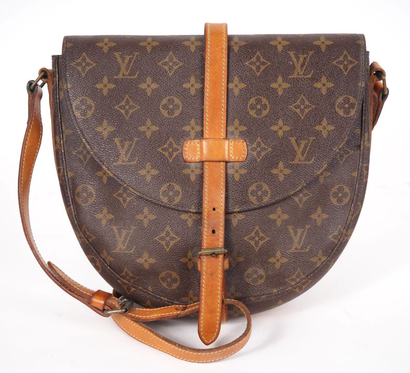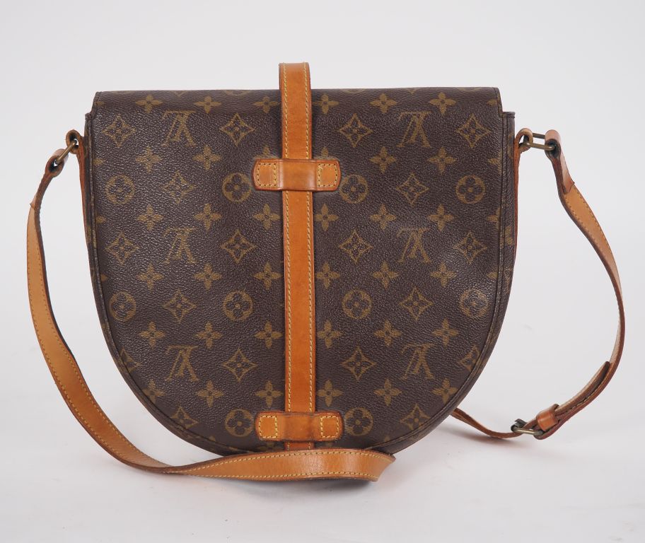 LOUIS VUITTON Sac CHANTILLY (c 1975). Toile monogramée et vache naturelle. Intérieur en peau de porc. Dim. 27 x 24 x 7 cm (pas d'usure majeure, cuir patiné) Expert : Geneviève Fontan
