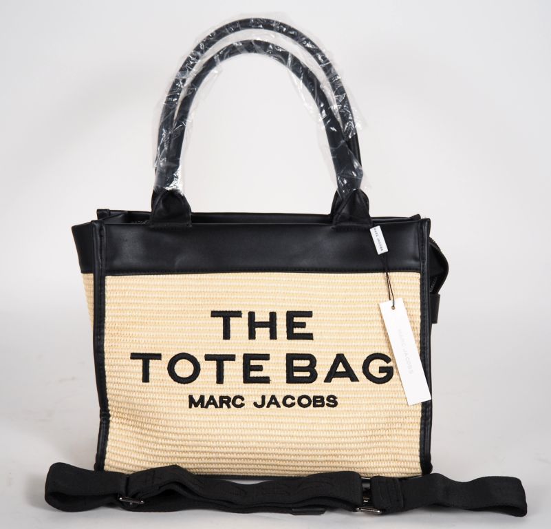 MARC JACOBS, Sac porté épaule en cuir (?) noir et coton, modèle "The Tote bag". Bandoulière en tissu amovible. Fermeture par zip, un compartiment central découvrant une poche plaquée et une poche à zip. Signé. 25 x 13 x 12 cm Etat neuf.