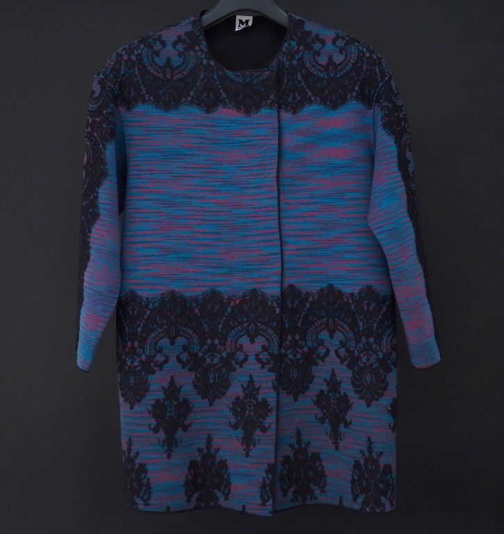 MISSONI Veste longue dans les tons rose, turquoise et noir en laine (74%) et polyester 24%. Fermeture à l'avant par cinq boutons à pression. Les manches, l'encolure et le bas de la veste ornés de dentelles. Doublure en coton (78%) et polyamide (22%). Taille. 42