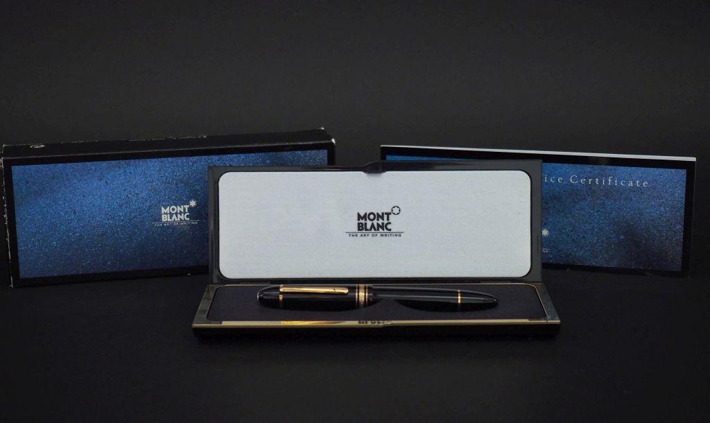MONTBLANC, Stylo plume en résine noir et métal doré. Plume deux tons d'or. Signé. Dans son écrin, sa boite d'origine et avec sa garantie.