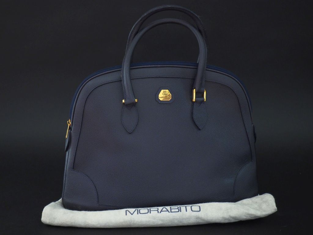 MORABITO, Paris Sac à main en cuir grainé bleu marine. Deux anses. Garniture en métal doré. Fermeture à zip. Une poche intérieure zipée et deux autres plaquées de tailles différentes. Signé. 28,5 x 39 c 15 cm Dans son pochon.