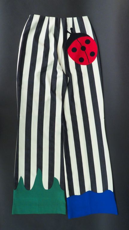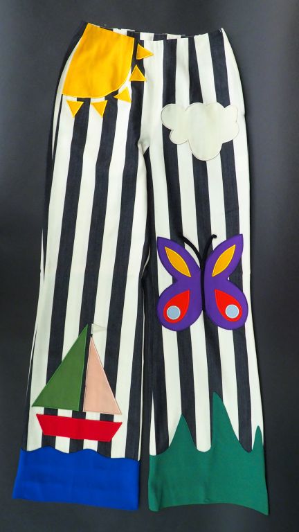 MOSCHINO Cheap and chic. Pantalon large, à motifs de couleur sur fond rayé noir et blanc. Fermeture éclair sur le côté. Taille 36.
