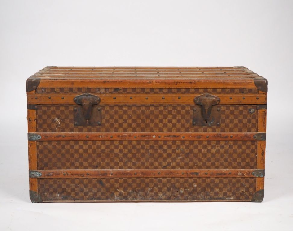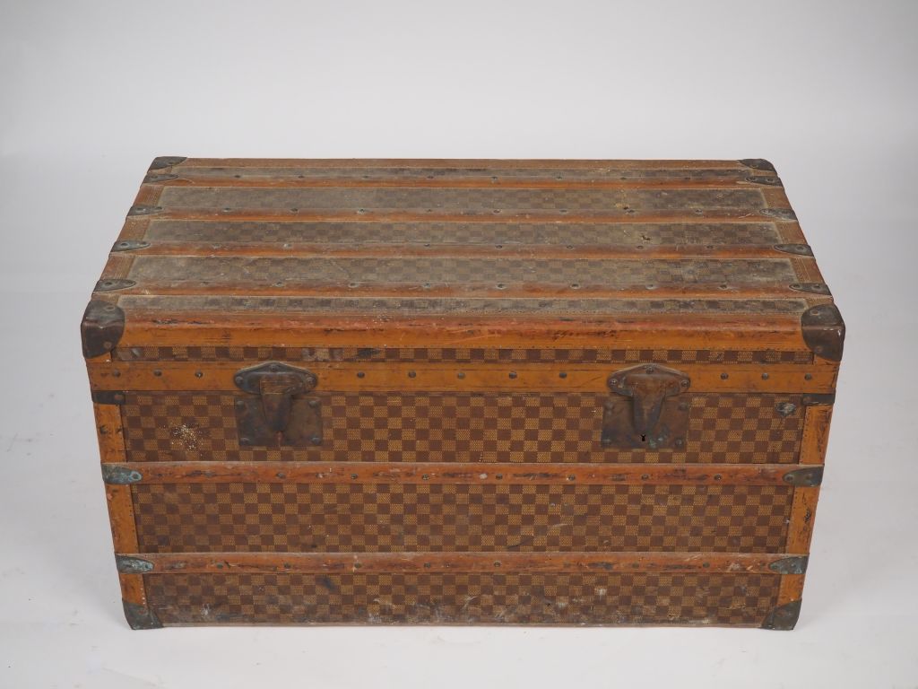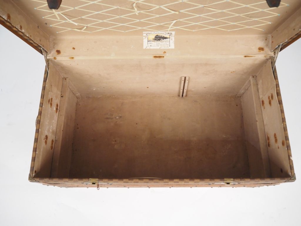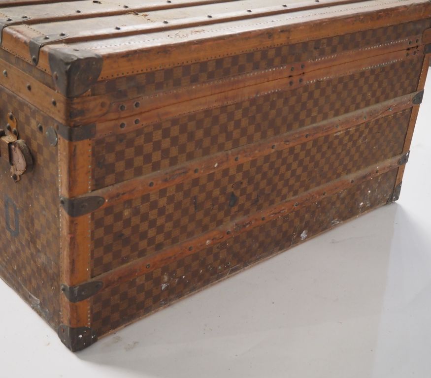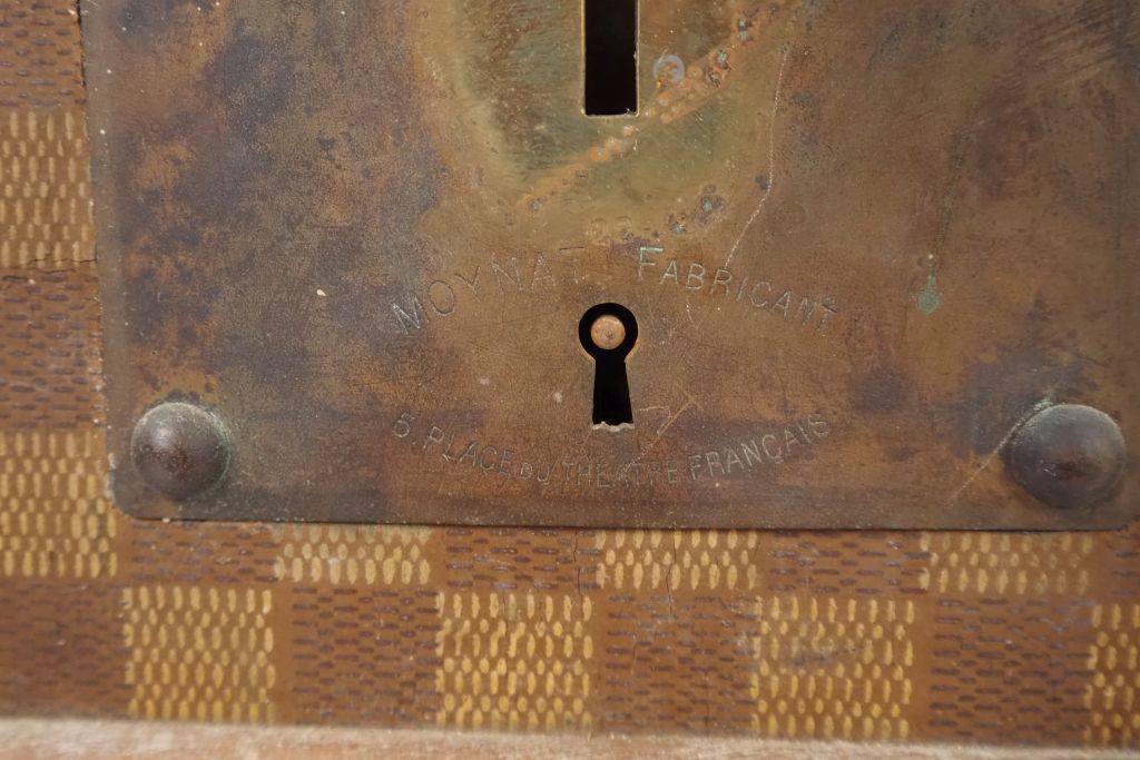 MOYNAT. Malle de voyage en toile enduite, à décor de damier. Poignées latérales en cuir. Renforts de lattes en bois. Intérieur gainé de tissu (sans casier). Etiquette de la maison MOYNAT. 48,5 x 90,5 x 48,5 cm (manques et accidents)
