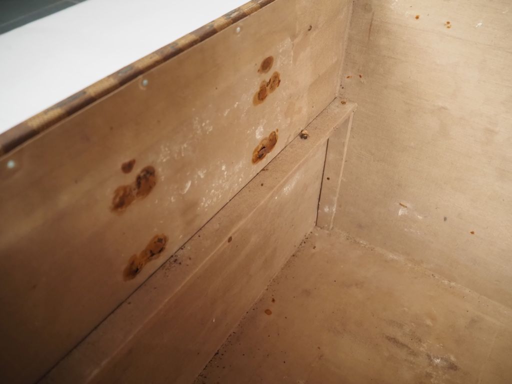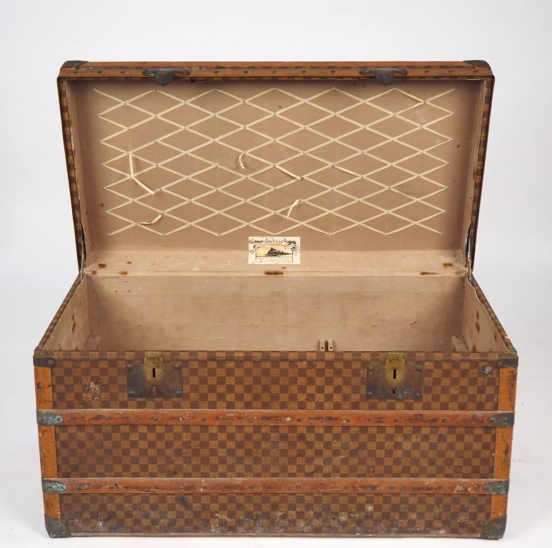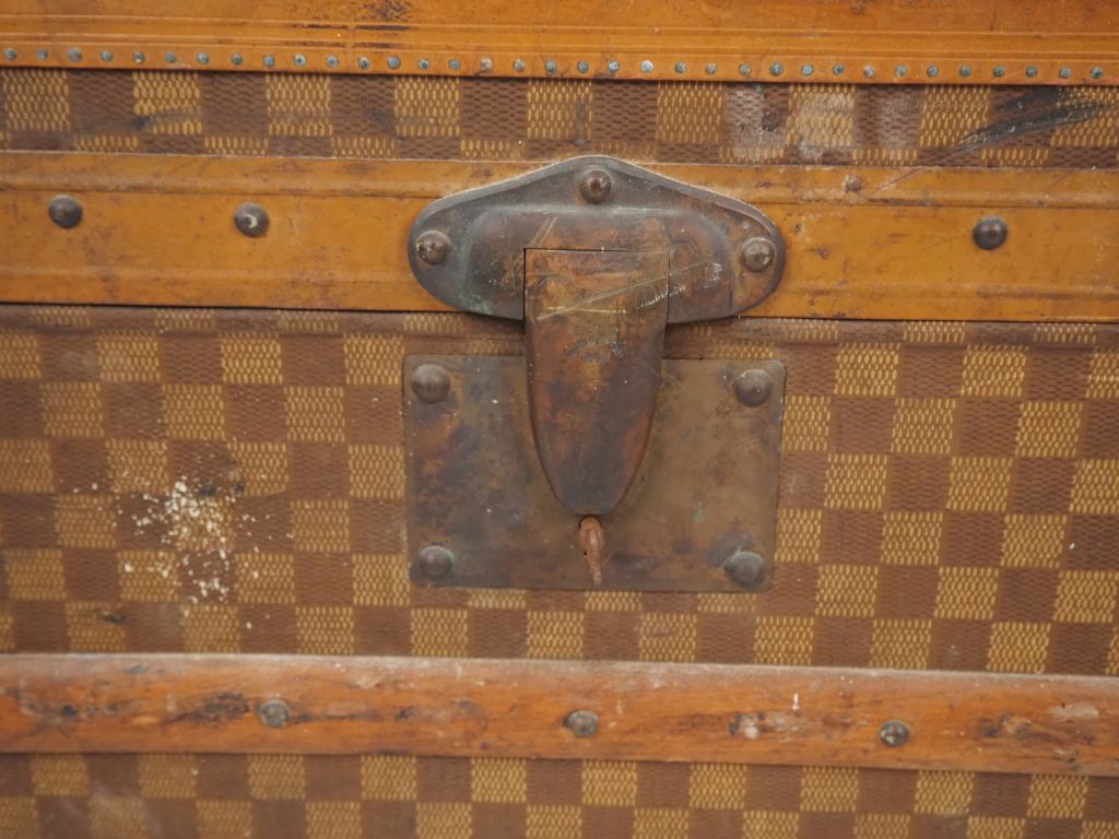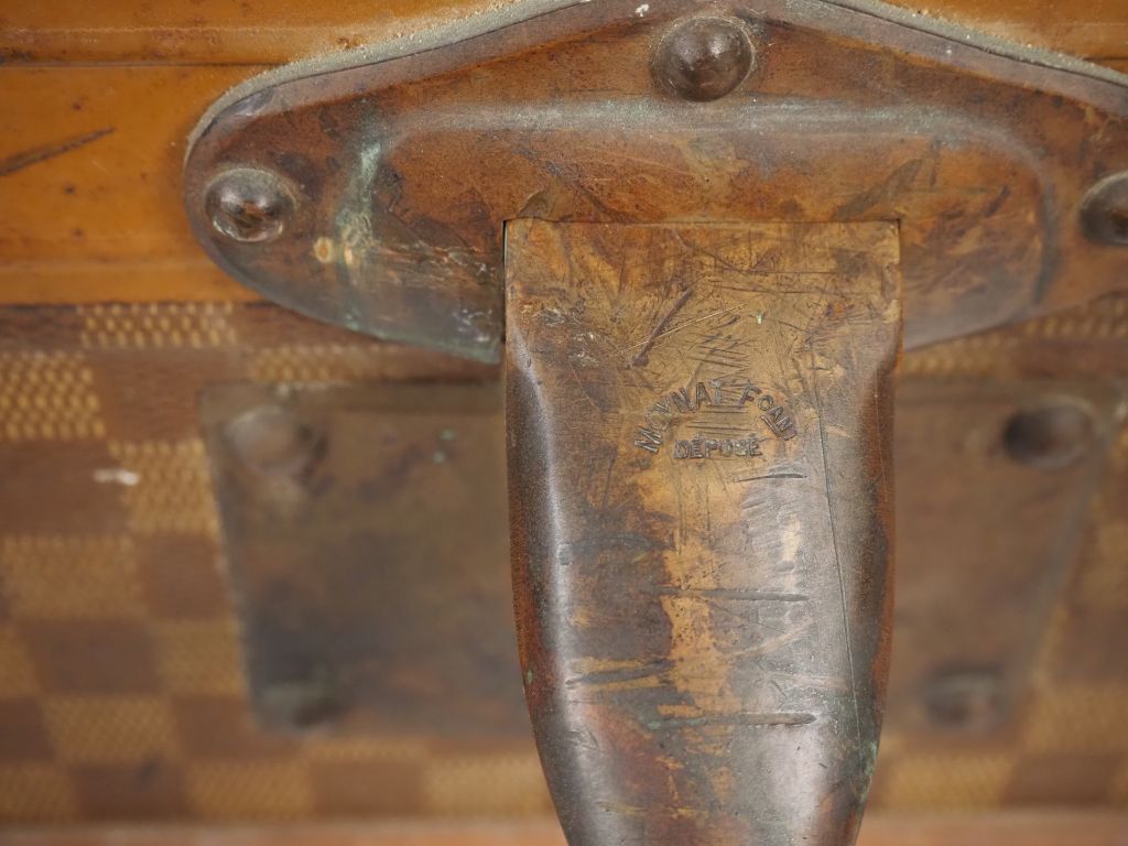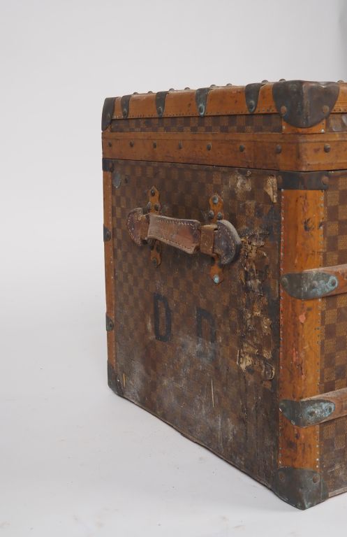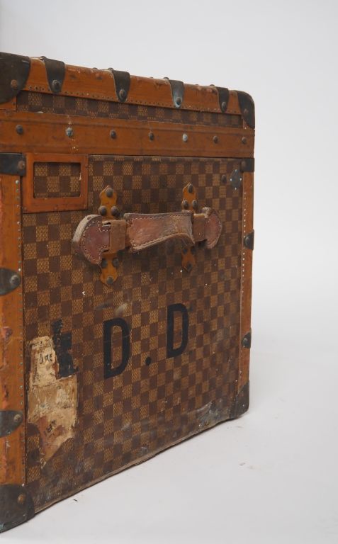 MOYNAT. Malle de voyage en toile enduite, à décor de damier. Poignées latérales en cuir. Renforts de lattes en bois. Intérieur gainé de tissu (sans casier). Etiquette de la maison MOYNAT. 48,5 x 90,5 x 48,5 cm (manques et accidents)