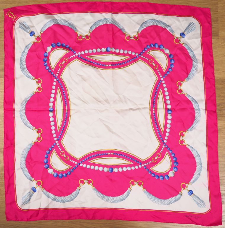 Must de CARTIER. Foulard probablement en soie de couleur fushia, crème, bleu et or. Signé. (petit accroc)