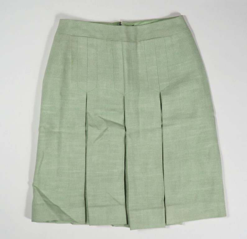 Pierre CARDIN, Paris Jupe plissée vert clair. Fermeture par zip à l'arrière. Taille. 42 (étiquette indiquant la composition manquante, petites taches et usures)