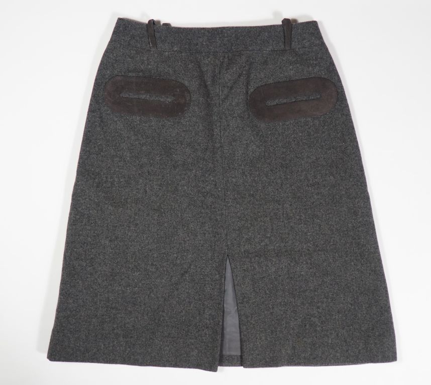 Pierre CARDIN, Paris Jupe taille haute probablement en laine grise. Fendue à l'avant. Deux fausses poches plaquées. Fermeture par zip à l'arrière. Taille présumée : 42 (étiquette indiquant la taille et la composition manquante, usures, petits trous)